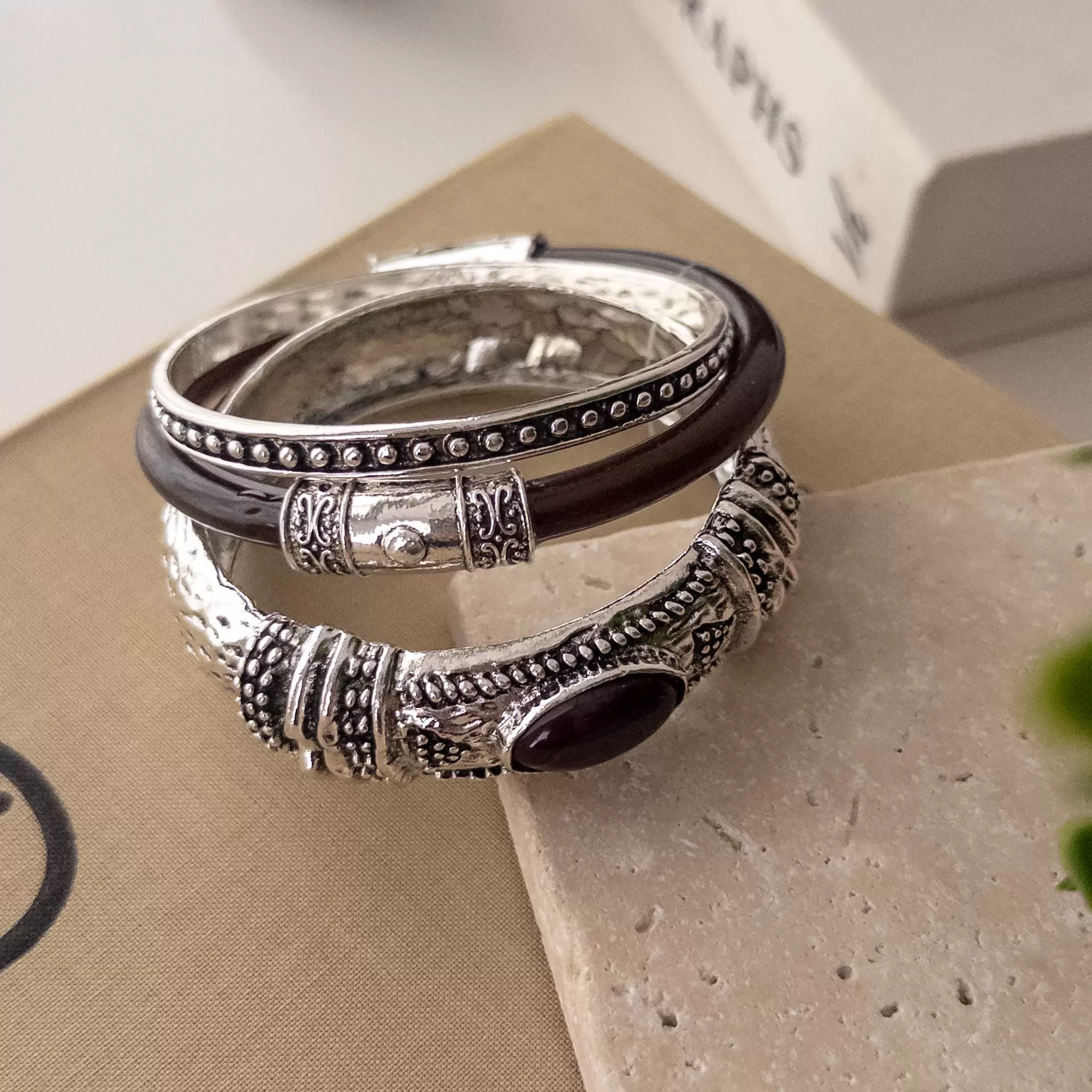 Bordo Taş Detaylı Kahverengi Ve Gümüş Renk Üçlü Tasarım Bilezik