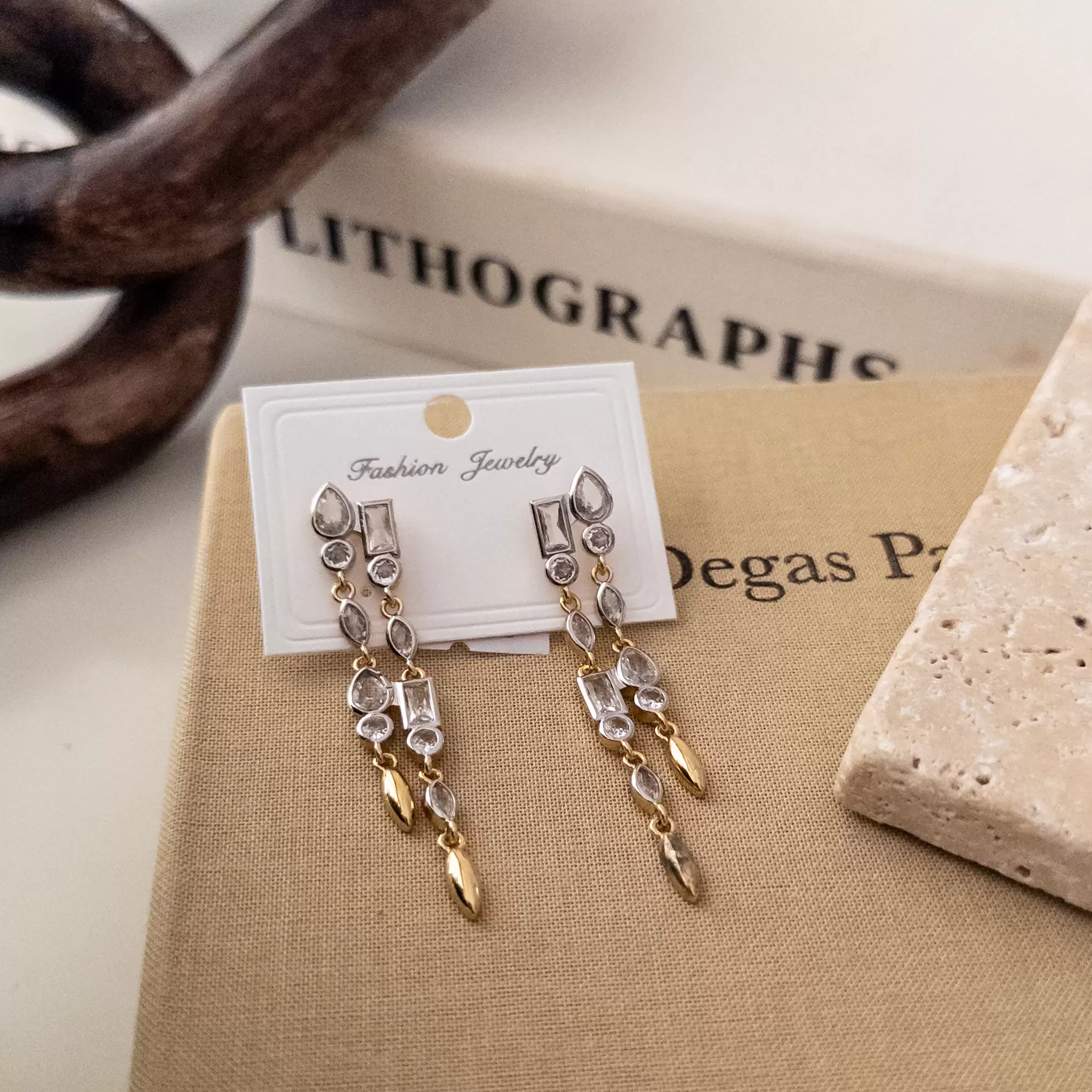 Çift Renk Zirkon Taşlı Uzun Sallantılı Tasarım Küpe