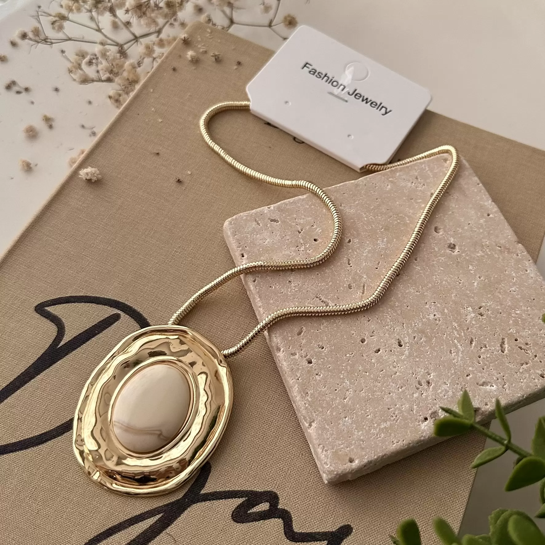 Ezme Plaka Ortası Krem Taş Görünümlü Yılan Zincirli Büyük Kolye