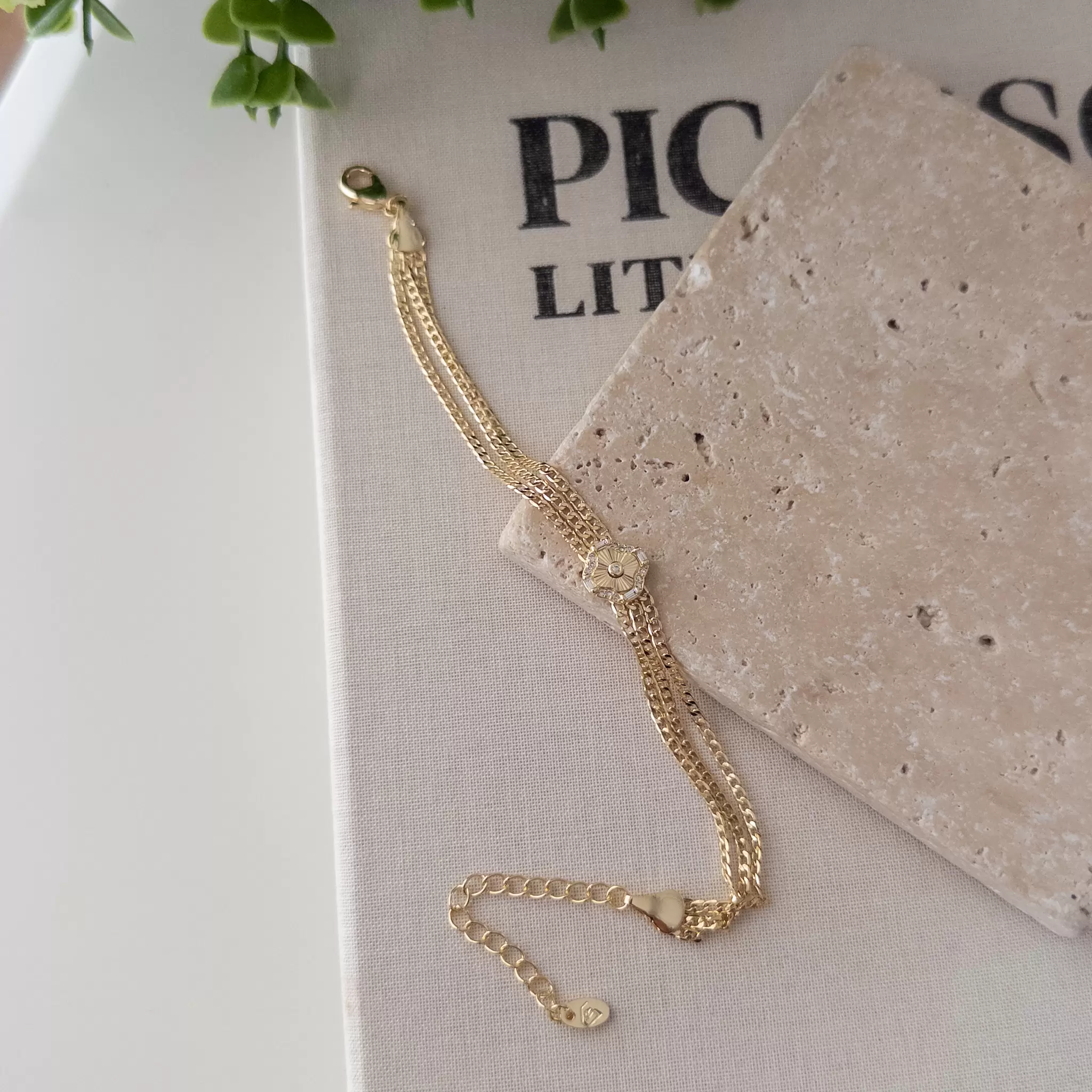 Gold Renk Ortası Zirkon Taş Detaylı Lazer Kesim Yonca Figürlü Üç Zincirli Zarif Bileklik