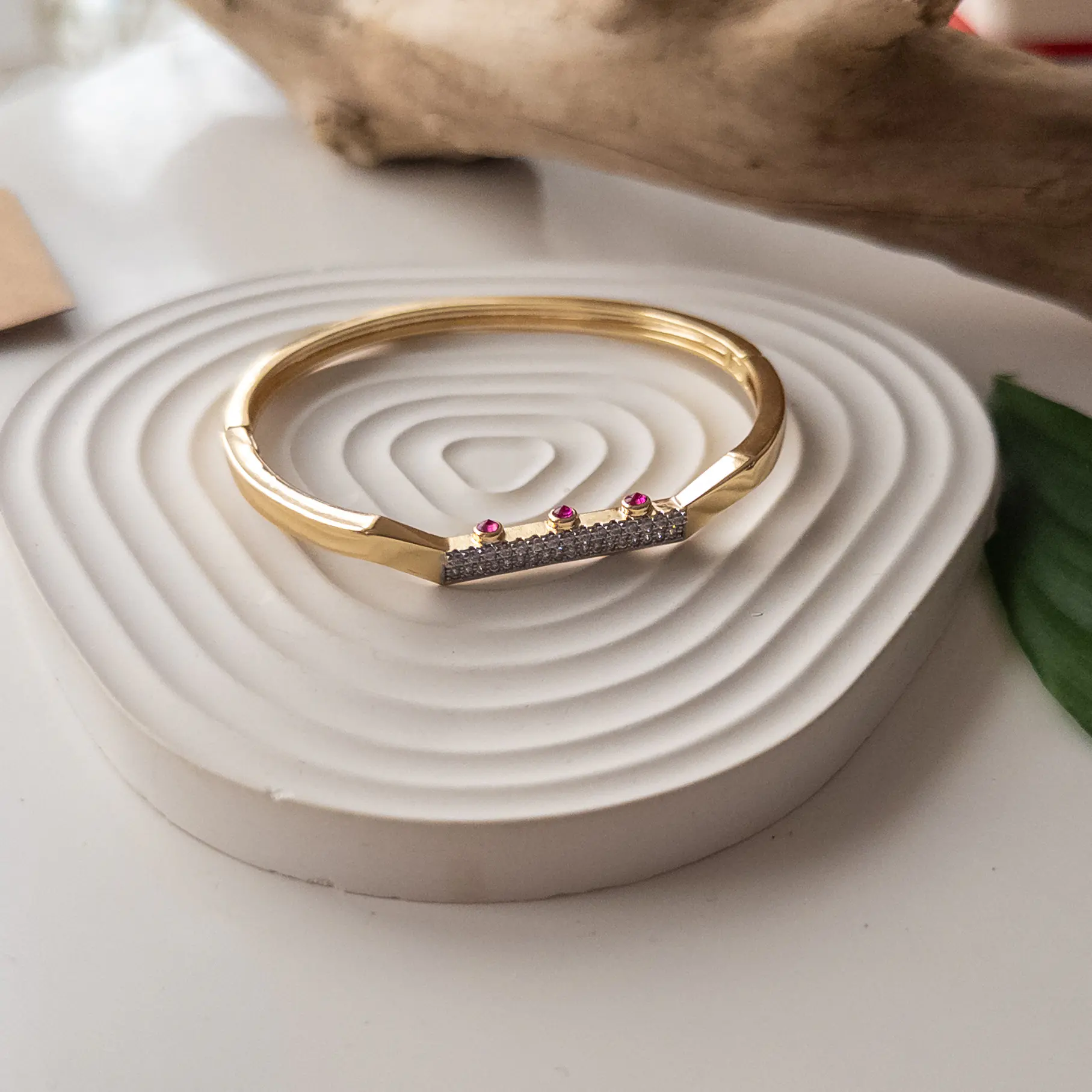 Gümüş Renk Zirkon Taş İşlemeli Fuşya Taş Detaylı Tasarım Kelepçe Bileklik
