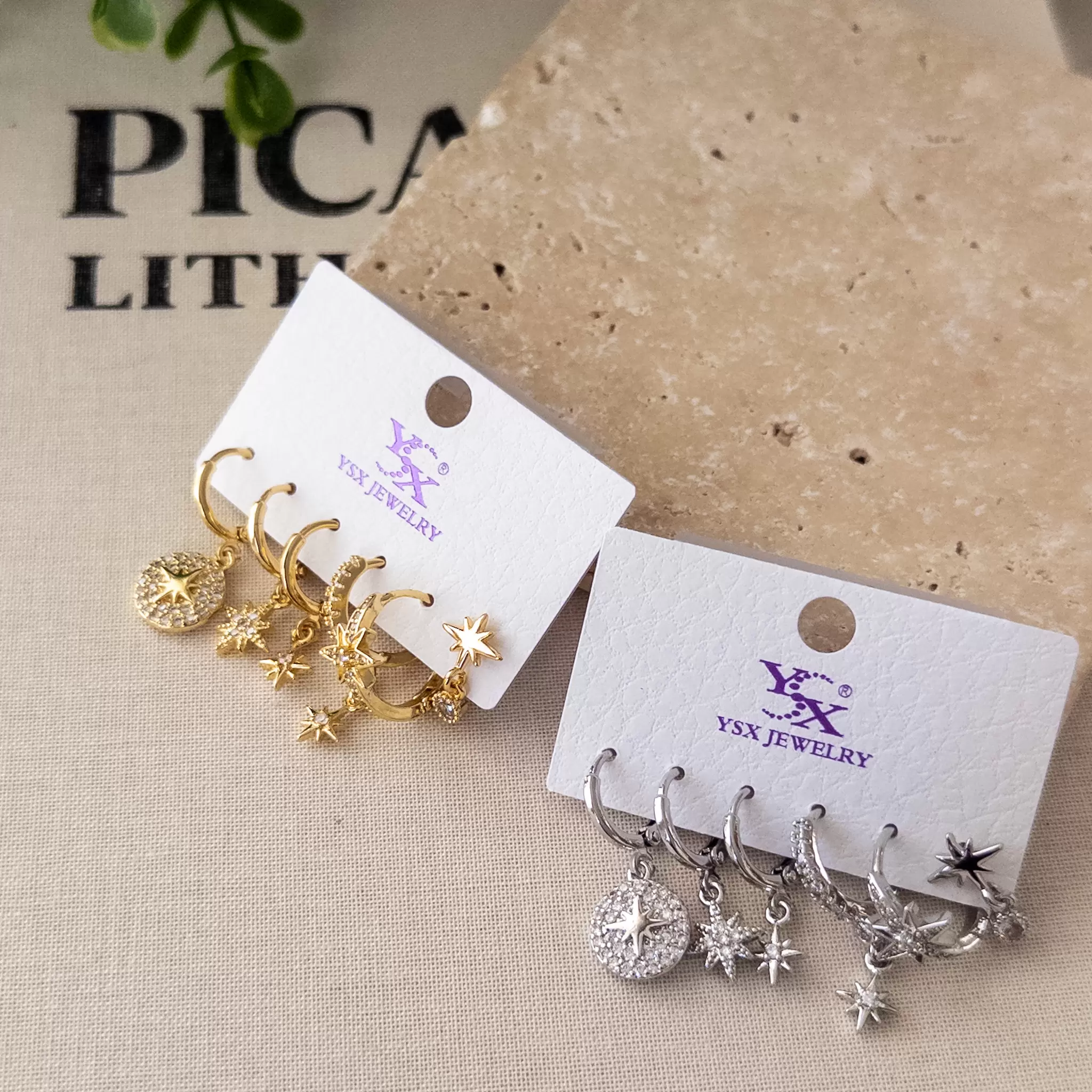 İthal Zirkon Taşlı Kutup Yıldızı Sallantılı Minimal Zarif Altılı Kombin Set Küpe