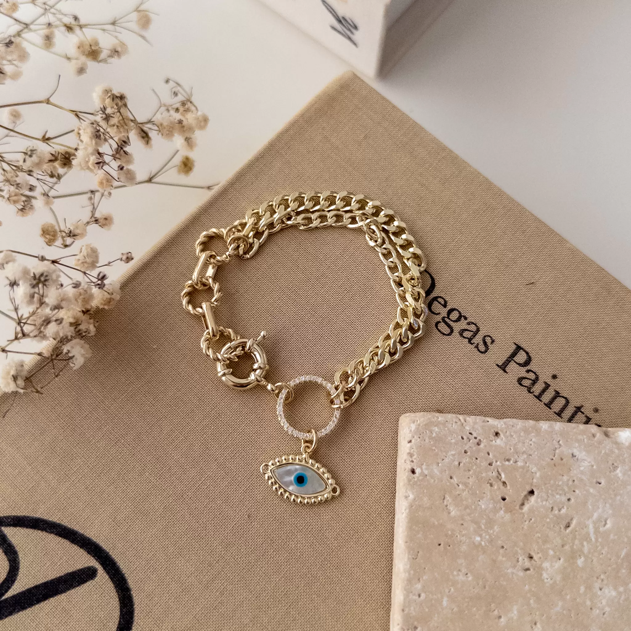 Özel Seri Zirkon Taş Detaylı Dümen Kapamalı Göz Sallantılı Tasarım Zincir Bileklik