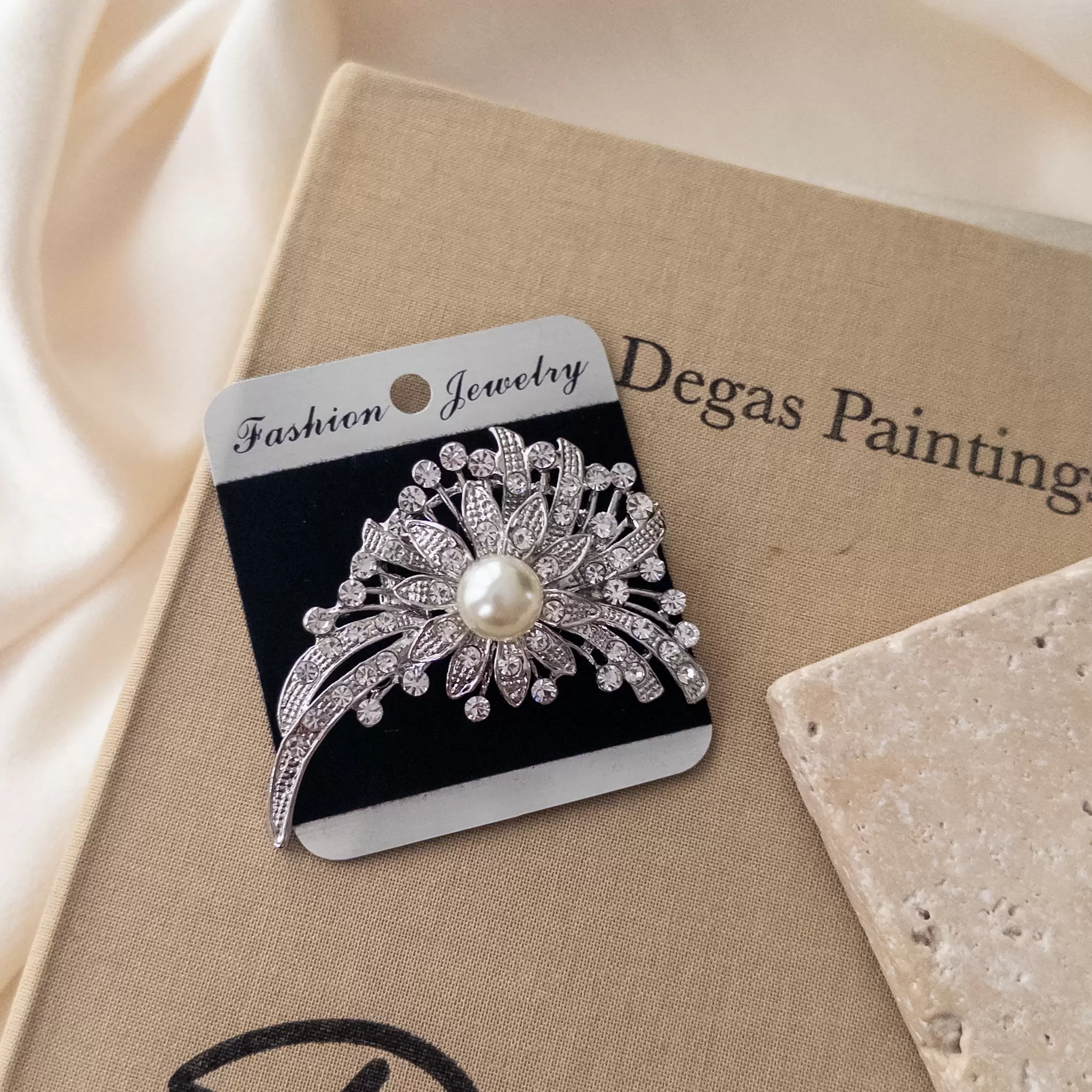Zirkon Taş İşlemeli Ortası İncili Çiçek Figürlü Büyük Broş
